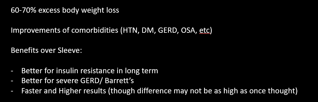 The Roux-en-Y gastric bypass is both a restrictive and malabsorptive procedure. It involves creating a small gastric pouch (approximately 30cc; restrictive) and creating malabsorption by limiting the uptake of nutrients to limited amounts of small bowel